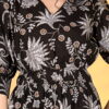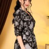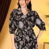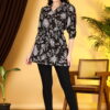 The classic black base with intricate floral print gives it a timeless and versatile appeal. Featuring a flattering V-neckline, three-quarter sleeves, and a gathered waist design, this tunic offers a comfortable yet stylish silhouette that suits all body types.