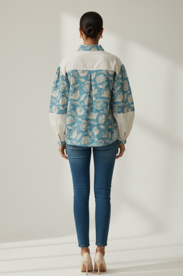 The elegant blue and white color combination and classic button-down silhouette make it a perfect choice for office wear, brunches, or casual evenings. The fine detailing and soft premium fabric ensure all-day comfort with a rich, graceful finish.