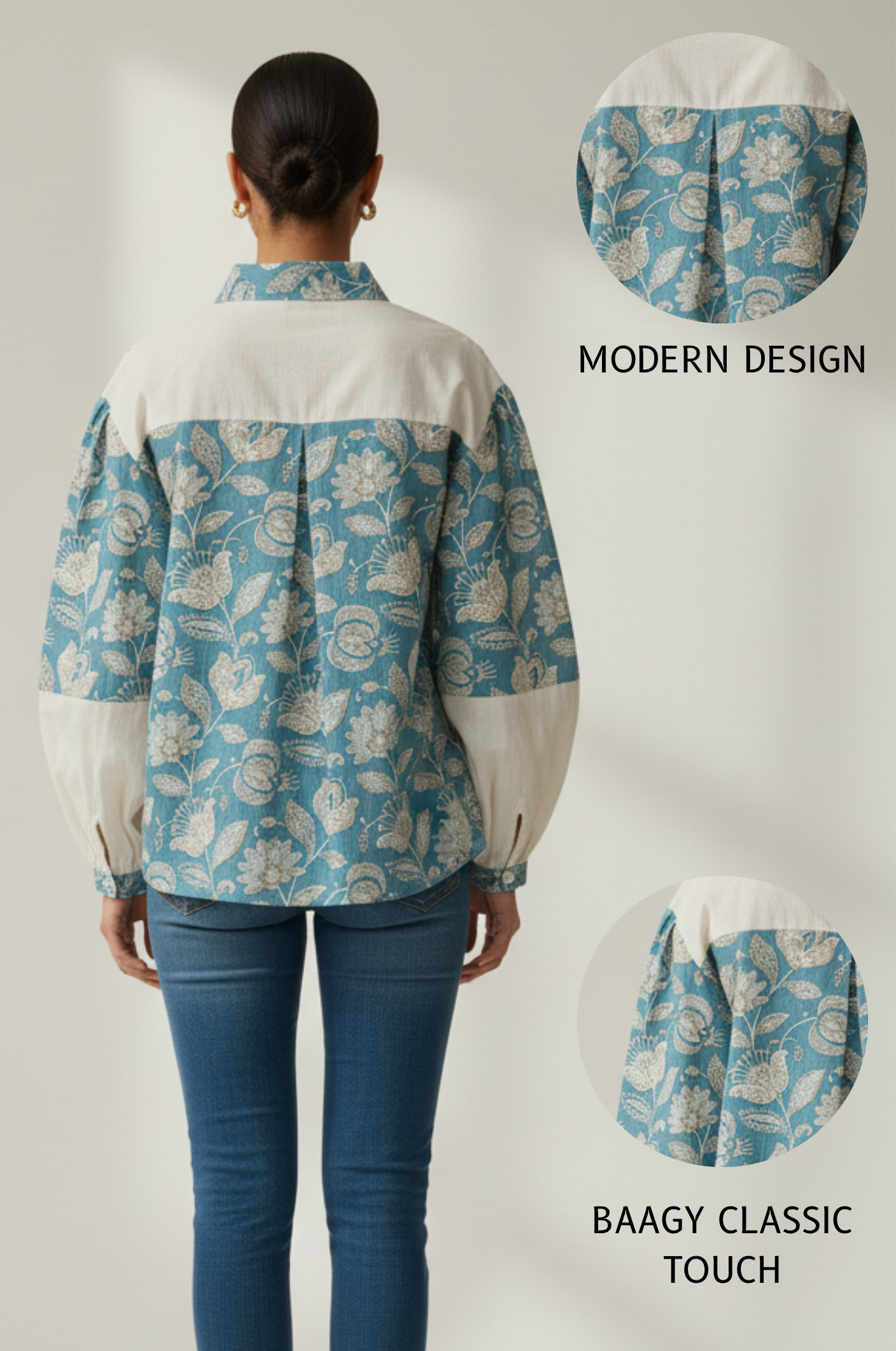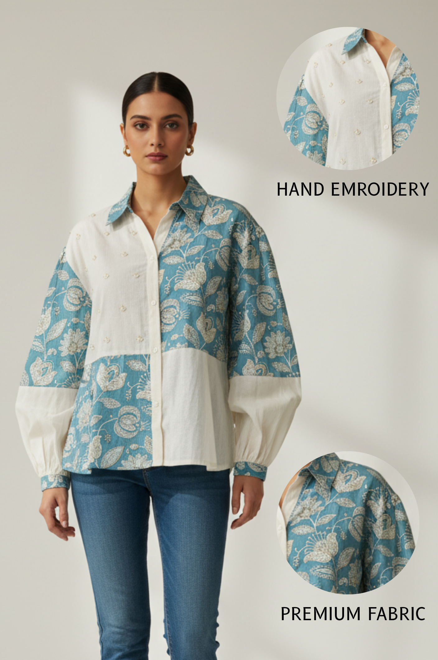 Premium Blue & White Floral Shirt with Hand Embroidery for Women | Tayara