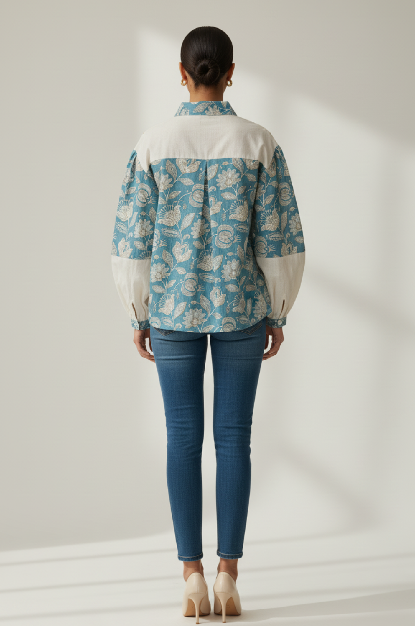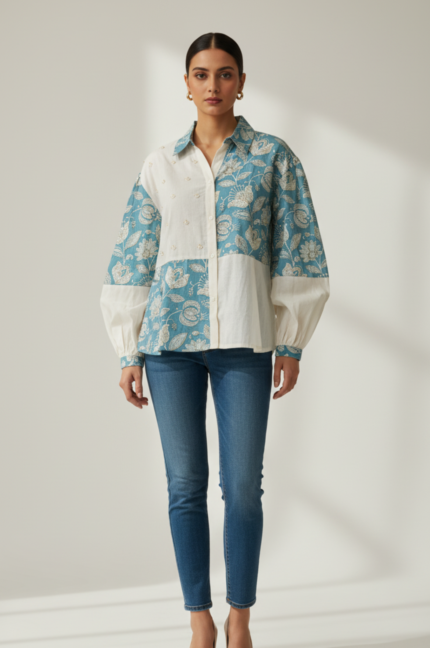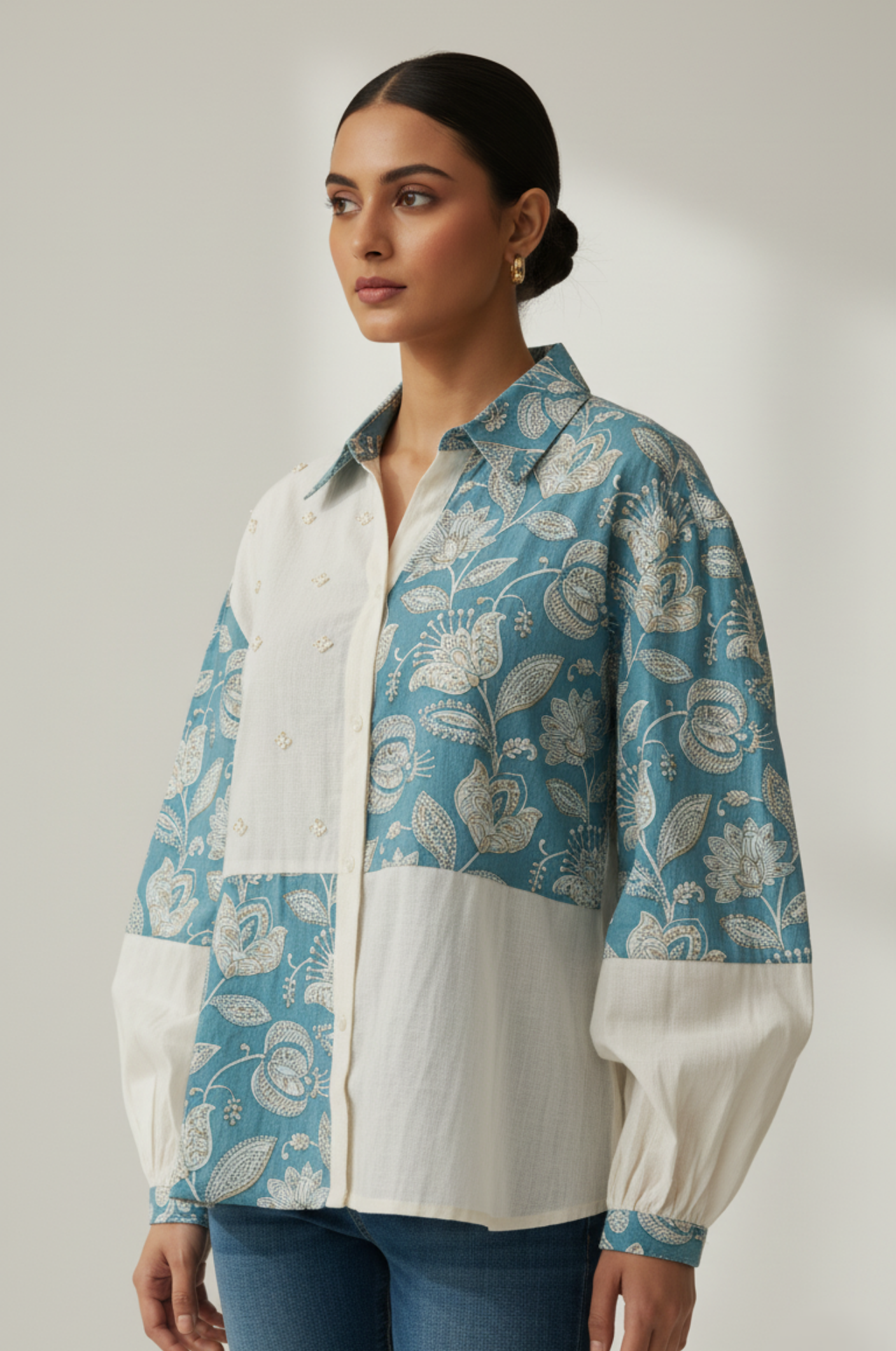 Premium Blue & White Floral Shirt with Hand Embroidery for Women | Tayara