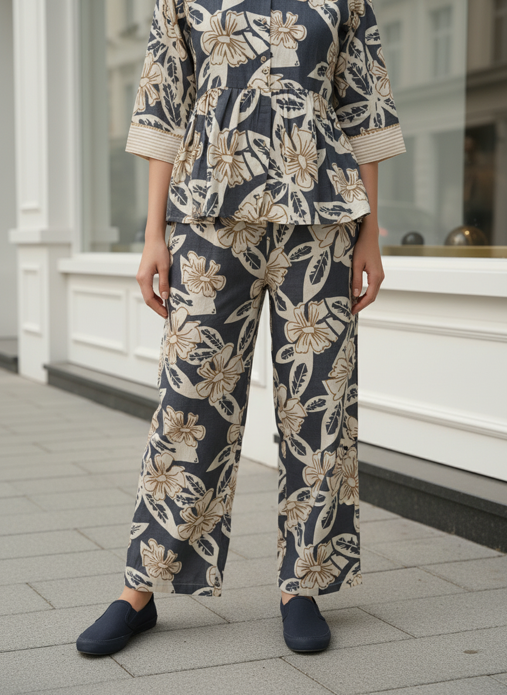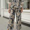 Effortlessly Matched: Wide-leg pants in matching print deliver a sleek, coordinated silhouette—style with heels or flats for versatile appeal.