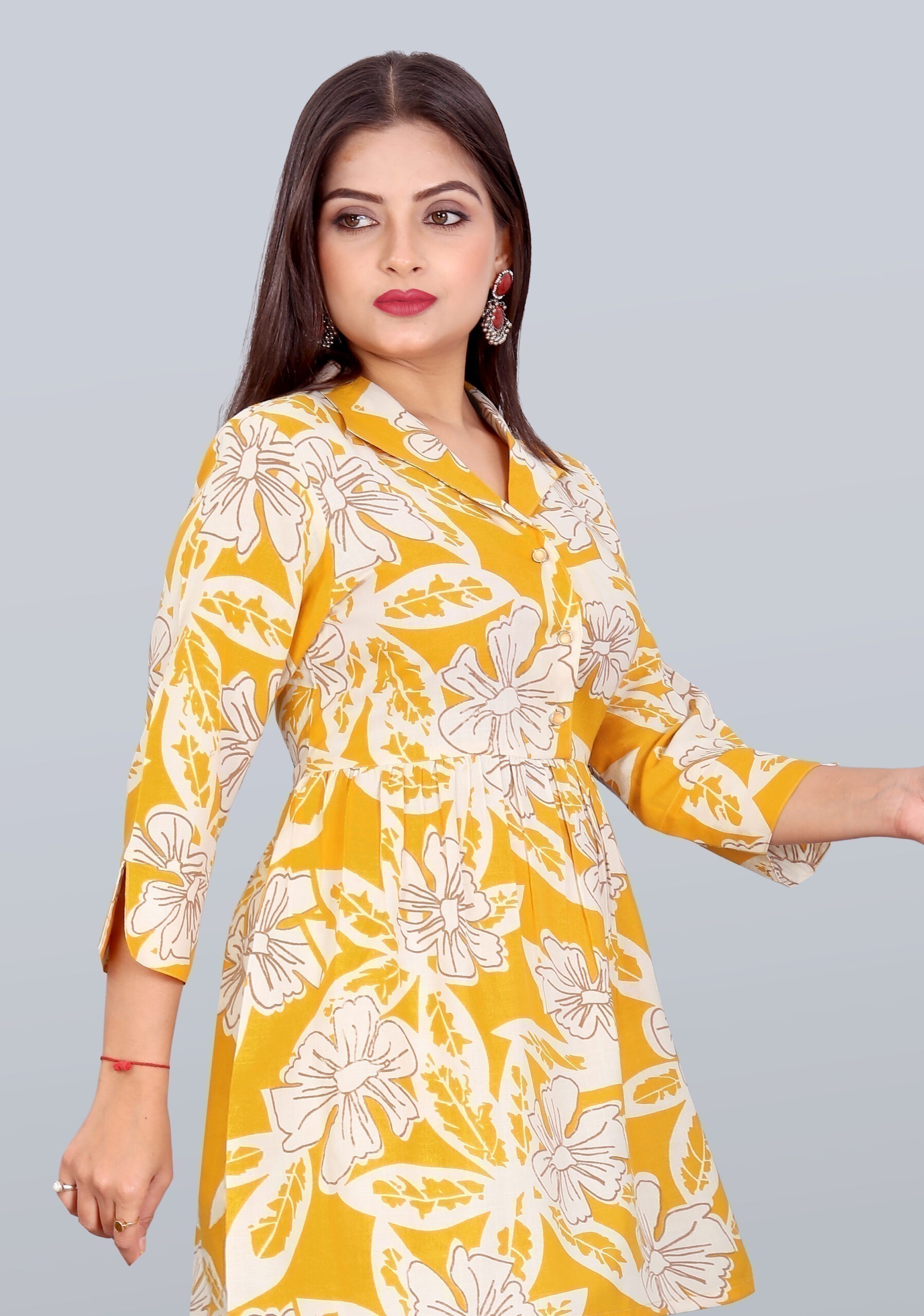 Flattering Fit: Notch collar tunic with a gently cinched waist and 3/4 sleeves featuring stylish slit cuffs for ease and elegance.